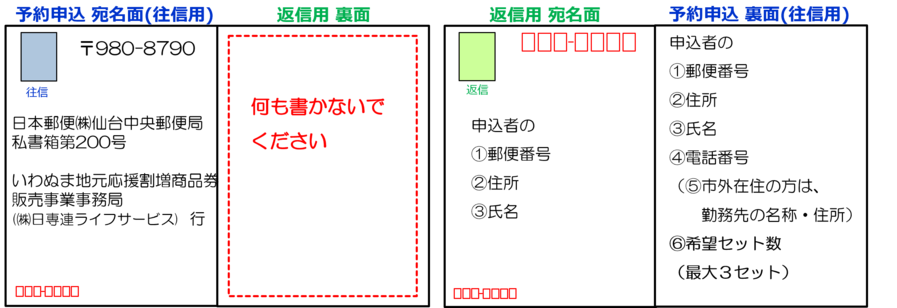 ①往復ハガキを購入していただき、必要事項を記入し、「いわぬま地元応援割増商品券販売事業事務局」(下の往復ハガキイメージ参照)宛て郵送してください。