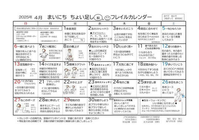 毎日の生活の中で「ちょっとだけ」「カンタンに」フレイル予防に取り組むことができる「まいにちちょい足し「脱」フレイルカレンダー」を毎月発行しています。ご自宅で家族と、地域で仲間と楽しく取り組むためにご活用ください。