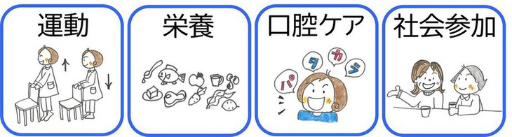 フレイル予防には「運動」「栄養」「口腔ケア」「社会参加」が大切です。