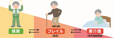 フレイルが進行し、食事がとれなかったり、転倒しやすくなることで、要介護状態になるリスクも高まります。