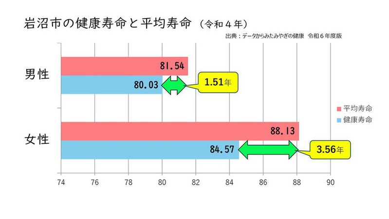 岩沼市の平均寿命と健康寿命の差は、令和4年で男性1.51年、女性3.56年となっています。