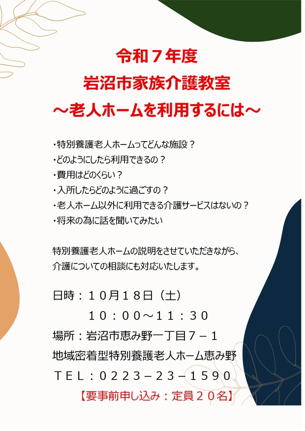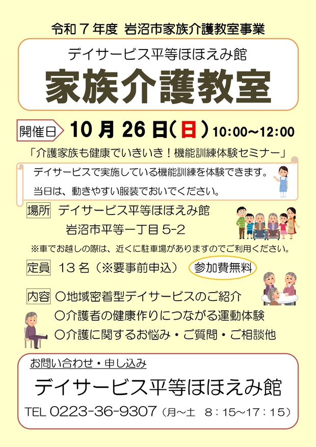 市内の地域密着型通所介護事業所又は地域密着型通所介護を運営している法人 計8事業所 で家族介護教室を開催します。詳細は以下をご確認ください。
