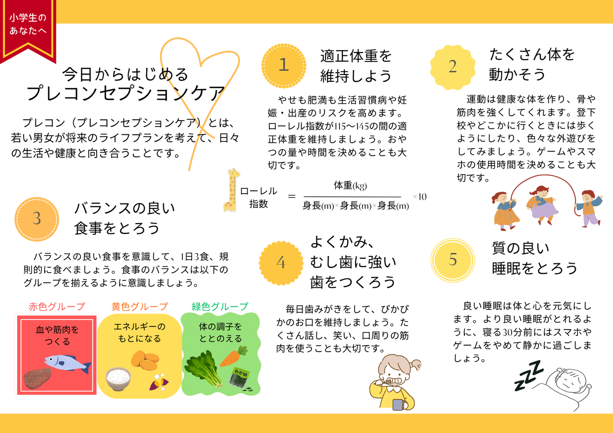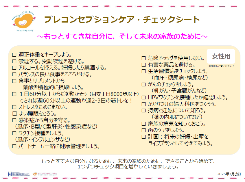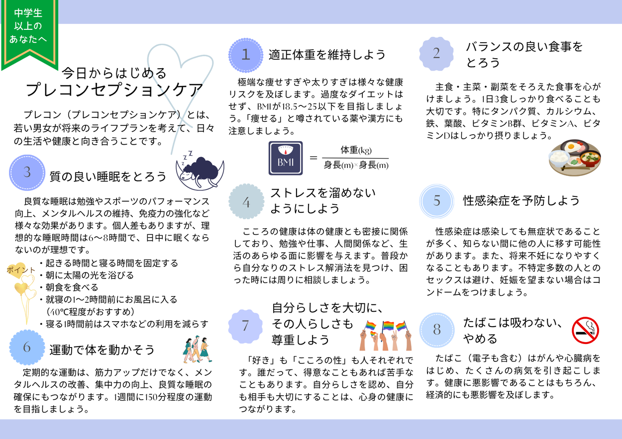 プレ(Pre)は「~の前」、コンセプション(Conception)は「妊娠・受胎」という意味であり、プレコンセプションケアとは、早い段階から将来のライフプランを考えて日々の生活や健康と向き合うことです。正しい知識を得て、健康に過ごすことは、次世代の健康にもつながり、また自分の希望するライフプランを考え、叶えるきっかけにもなります。ぜひ、この言葉を知った今からプレコンセプションケアを始めましょう。