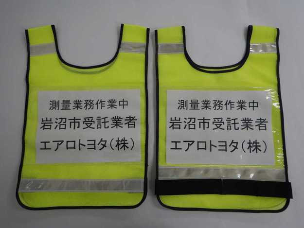 調査は岩沼市から委託された専門業者が行っており、画像(1)のとおり、「測量業務作業中 岩沼市受託業者 エアロトヨタ(株)」と印字された黄色ベストを着用し市発行の写真付身分証明書を携帯した上で作業しております。