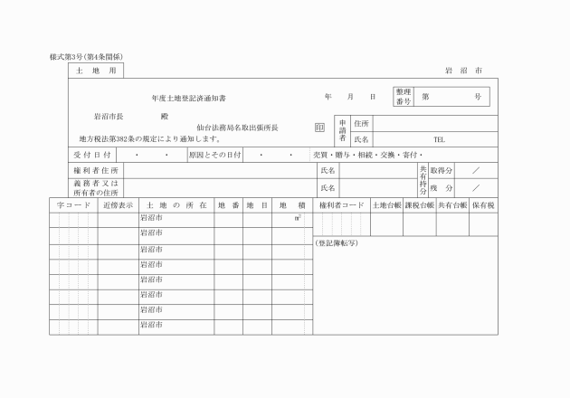 第10条 登記所は、登記の申請を受け登記手続きが完了したときは、速やかに登記申請書に添付されている登記済通知書用紙等に受付日付及び登記原因とその日付等を記載して、当該物件所在地の市長に通知するものとする。
