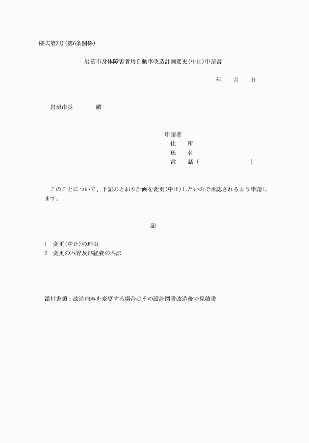 第4条 補助金の交付を受けようとする者(以下「申請者」という。)は、改造を行う前にあらかじめ関係書類を添えて岩沼市身体障害者用自動車改造費補助金交付申請書(様式第1号)を市長に提出しなければならない。
