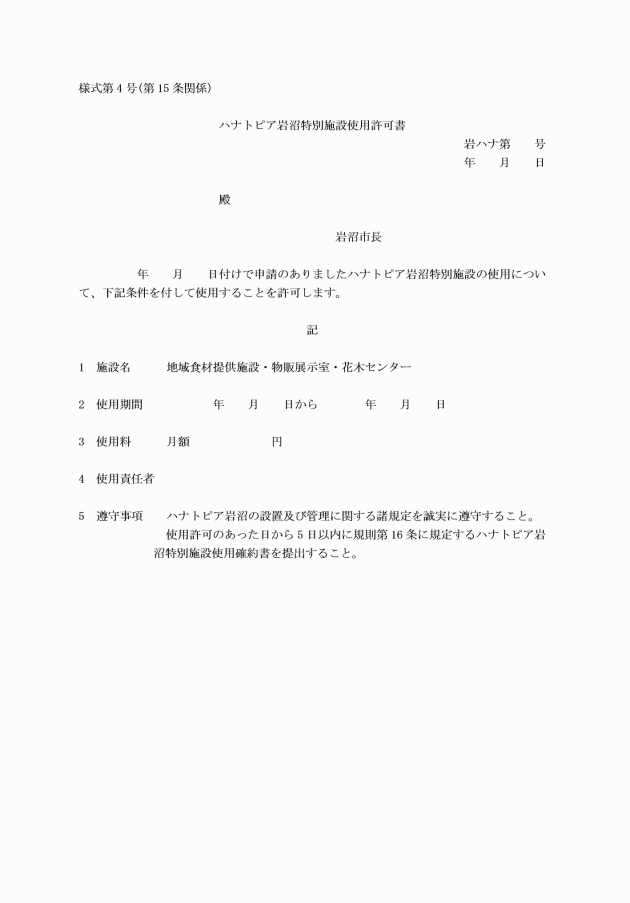 第19条 特別施設使用者は、特別施設及び附帯施設の用途又は原状を変更してはならない。ただし、市長の許可を受けたときは、この限りでない。