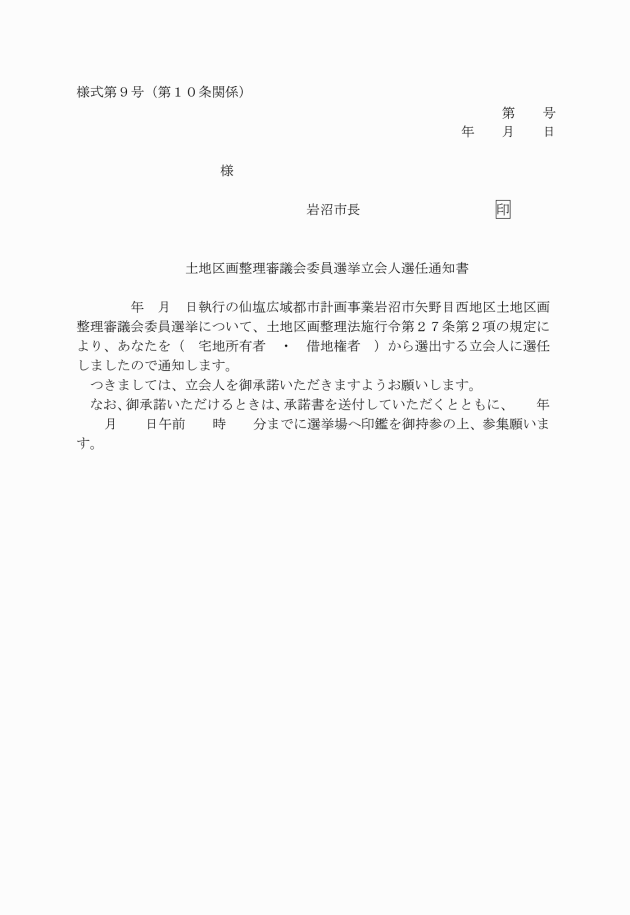 第19条 令第35条第5項の規定による当選に対する通知は、土地区画整理審議会委員選挙当選通知書(様式第17号)による。