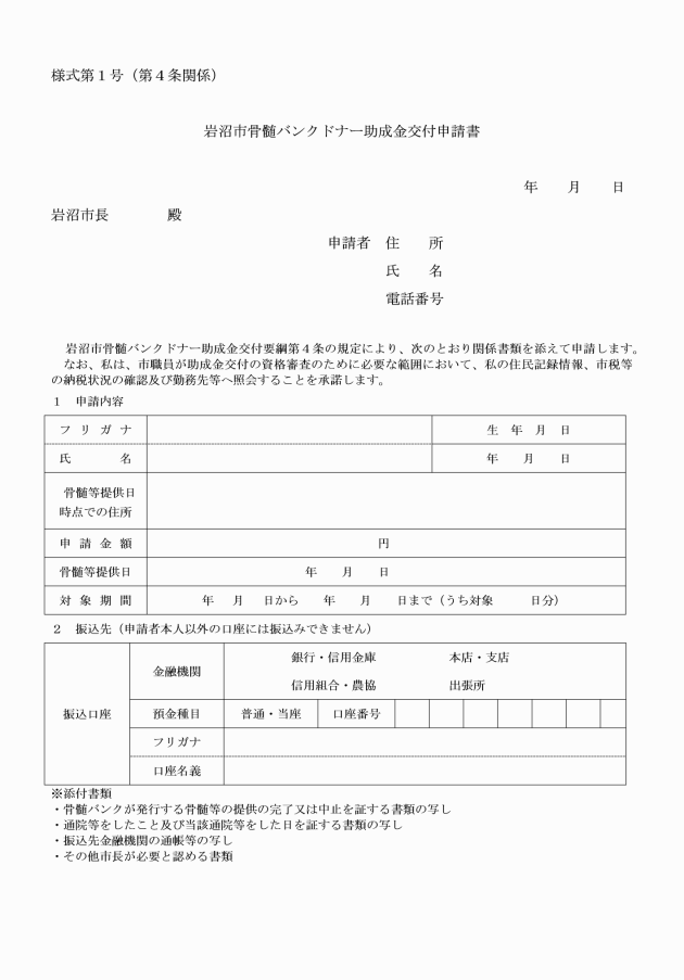 第4条 助成金の交付を受けようとする者(以下「申請者」という。)は、骨髄等提供日の翌日から起算して90日以内に岩沼市骨髄バンクドナー助成金交付申請書(様式第1号。以下「申請書」という。)に次に掲げる書類を添えて、市長に提出しなければならない。ただし、90日以内に提出できないことについて、やむを得ないと市長が認めた場合は、この限りでない。