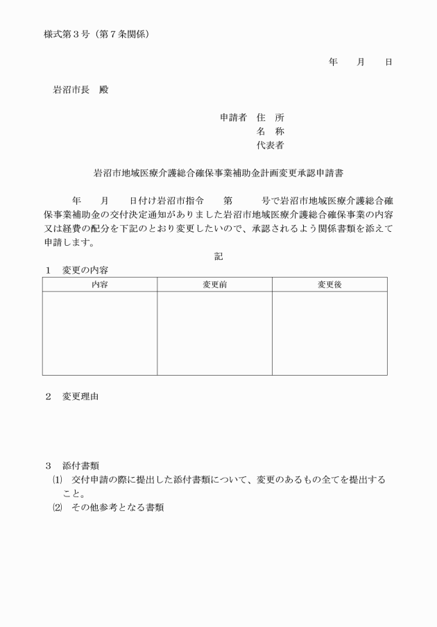 (1) 補助事業に要する経費の配分又は補助事業の内容を変更する場合は、当該理由が生じた後速やかに、岩沼市地域医療介護総合確保事業補助金計画変更承認申請書(様式第3号)により申請し、市長の承認を受けるものとする。