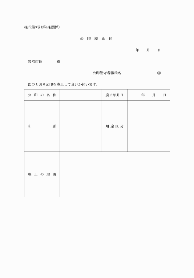 第5条 管理者は、公印を新調し、改刻し、又は廃止したときは、当該公印の名称、用途、印影及び使用の開始又は廃止の期日を告示するものとする。