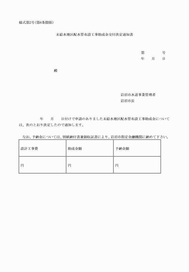 第5条 助成金の交付を受けようとする者(以下「申請者」という。)は、未給水地区配水管布設工事助成金交付申請書(様式第1号)に必要書類を添付し、管理者に提出しなければならない。