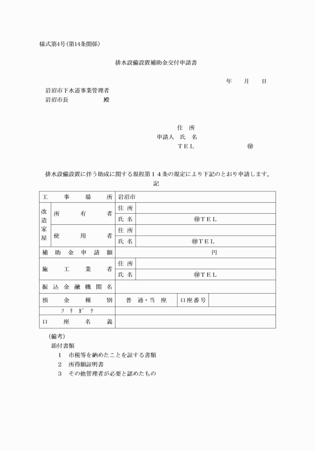 第7条 融資あっせんを受けようとする者は、排水設備設置に伴う融資あっせん及び利子補給申請書(様式第1号)に次に定める書類を添えて下水道事業の管理者の権限を行う市長(以下「管理者」という。)に申請しなければならない。